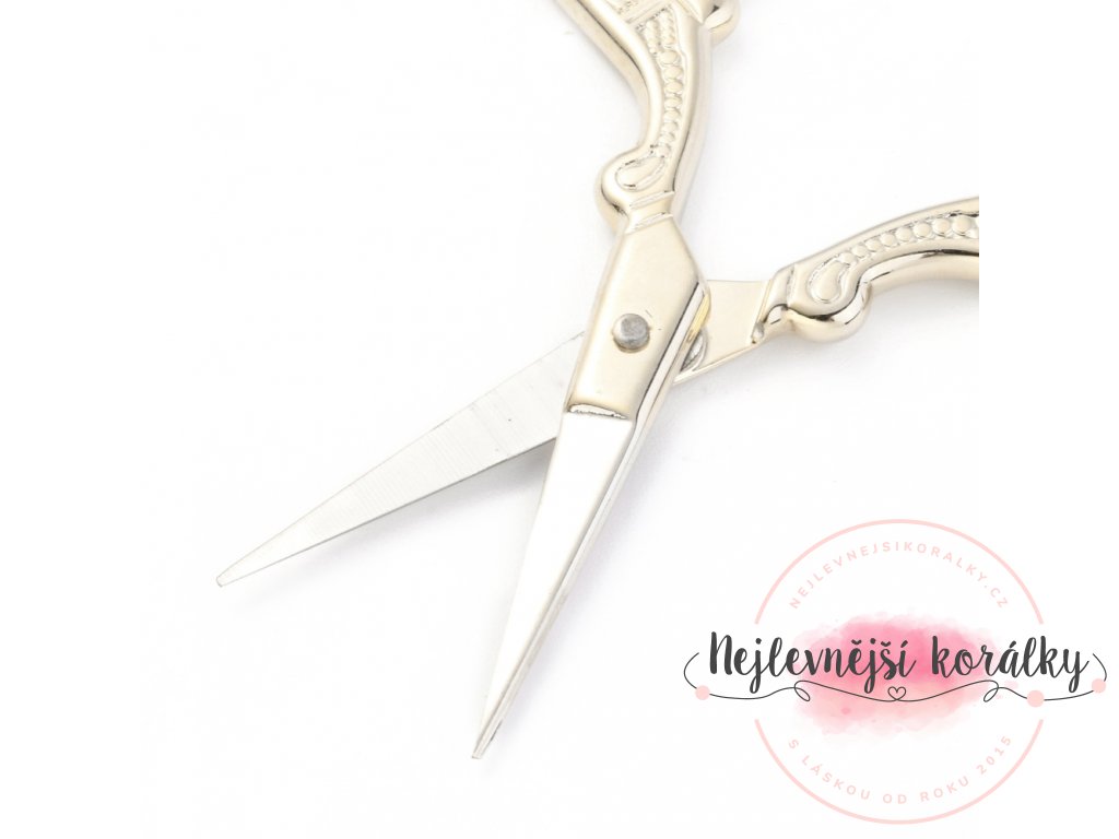 Nůžky jsou vyrobeny z nerezové oceli a rukojeť je zbarvená do světle zlatavé barvy.