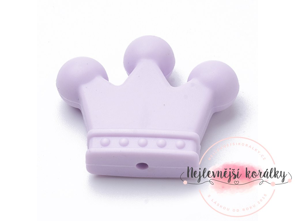 Silikonový korálek ve tvaru korunky v šeříkovém provedení o výšce 30 mm, šířce 35 mm a hloubce 10 mm s velikostí průvleku 2 mm.