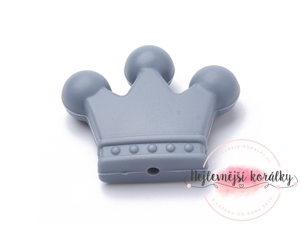 Silikonový korálek ve tvaru korunky v tmavě šedém provedení o výšce 30 mm, šířce 35 mm a hloubce 10 mm s velikostí průvleku 2 mm.