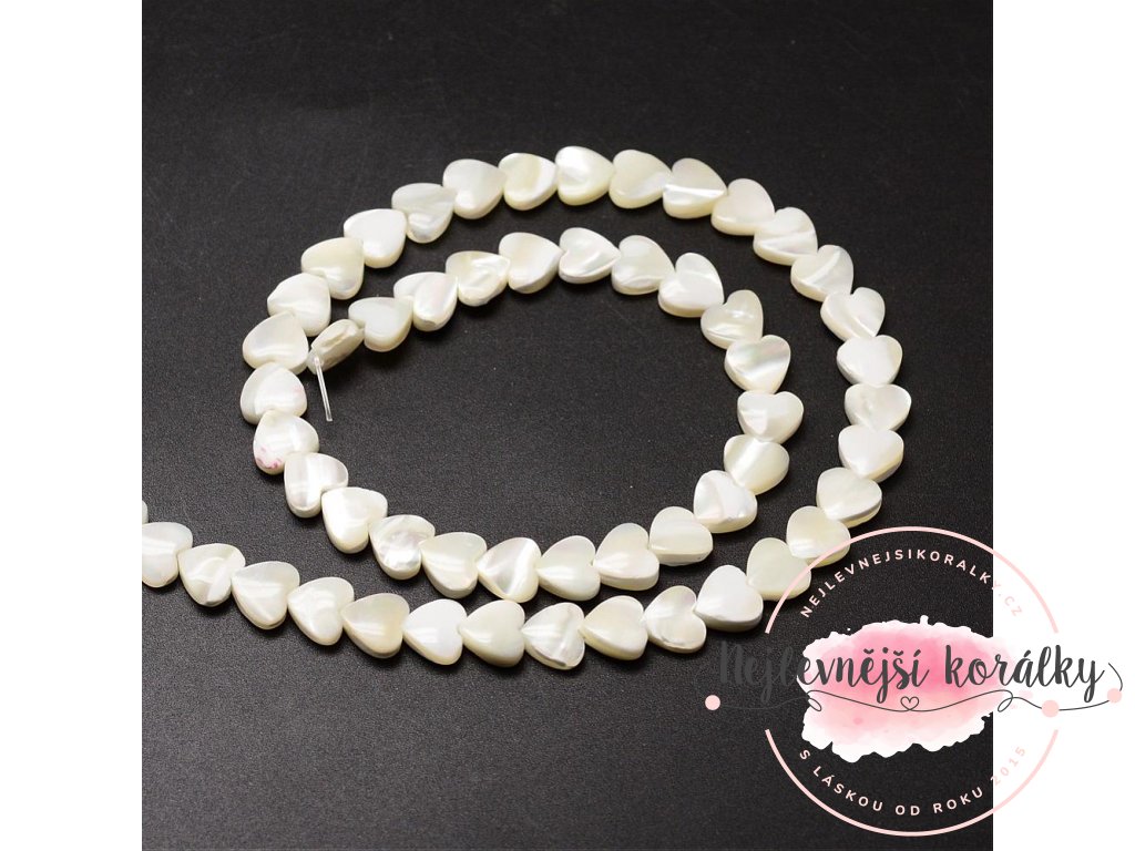 Přírodní korálky z perleti ve tvaru srdíček o délce 8 mm, šířce 8 mm a hloubce 3~4 mm s velikostí průvleku 0,8 mm.