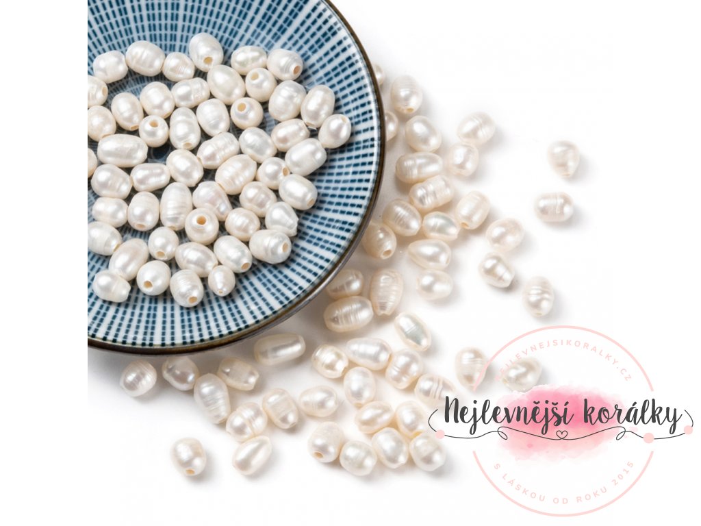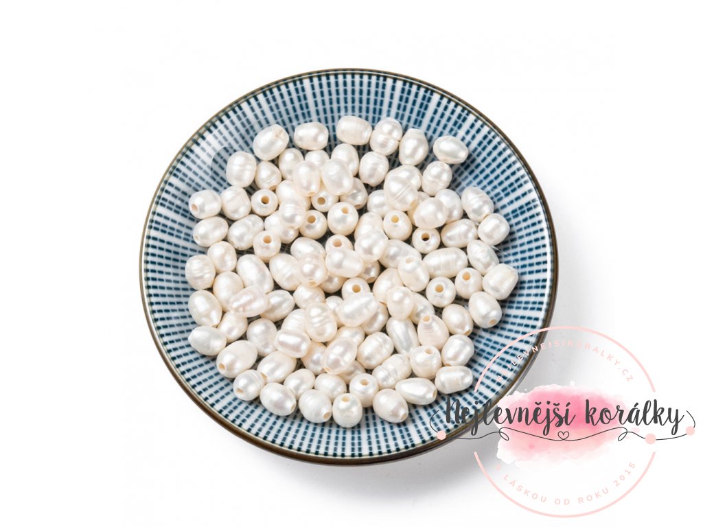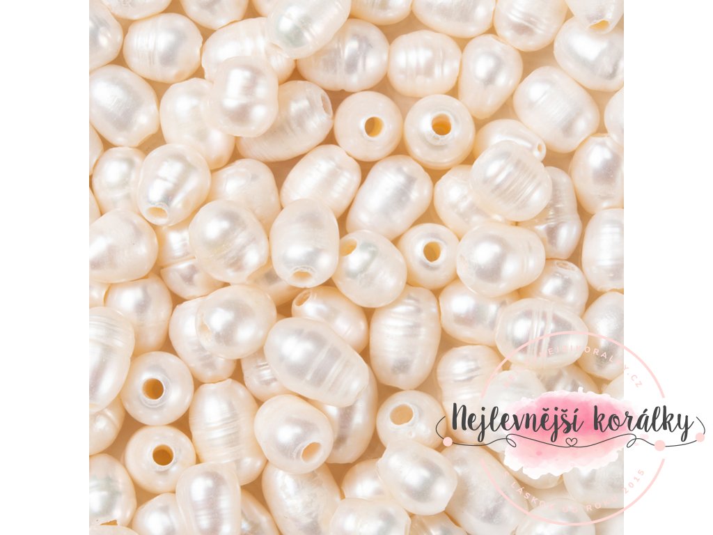 Exkluzivní přírodní sladkovodní perla o velikosti cca 7 - 9 mm x 6 - 7 mm se širším průvlekem 1,4 mm.