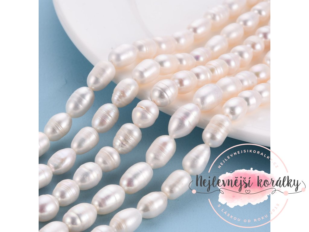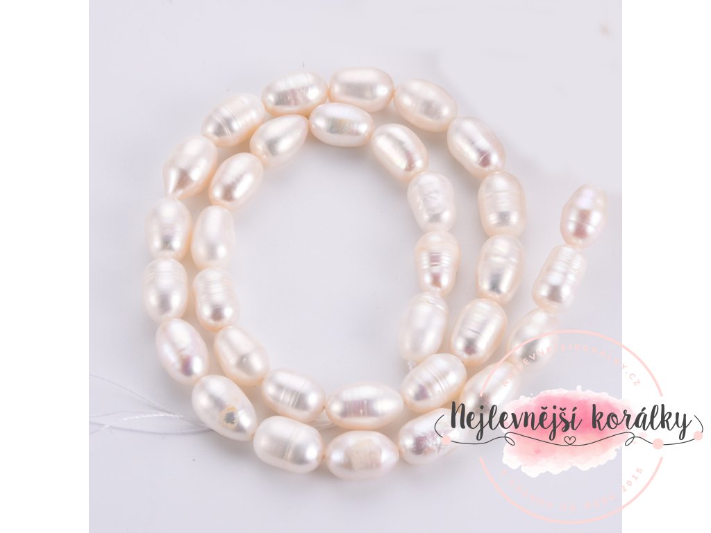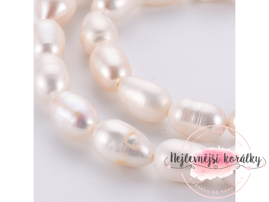 Exkluzivní přírodní sladkovodní perla třídy AA v krémově bílé barvě o velikosti 8-10mm x 7-8mm s velikostí průvleku 0,6 mm.