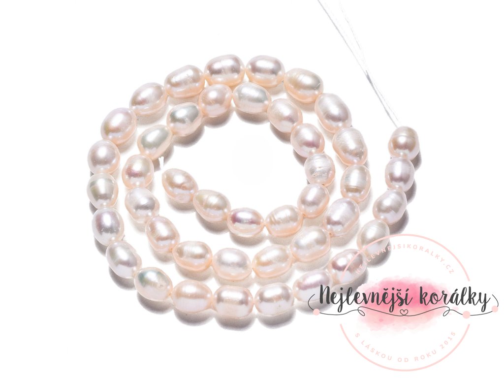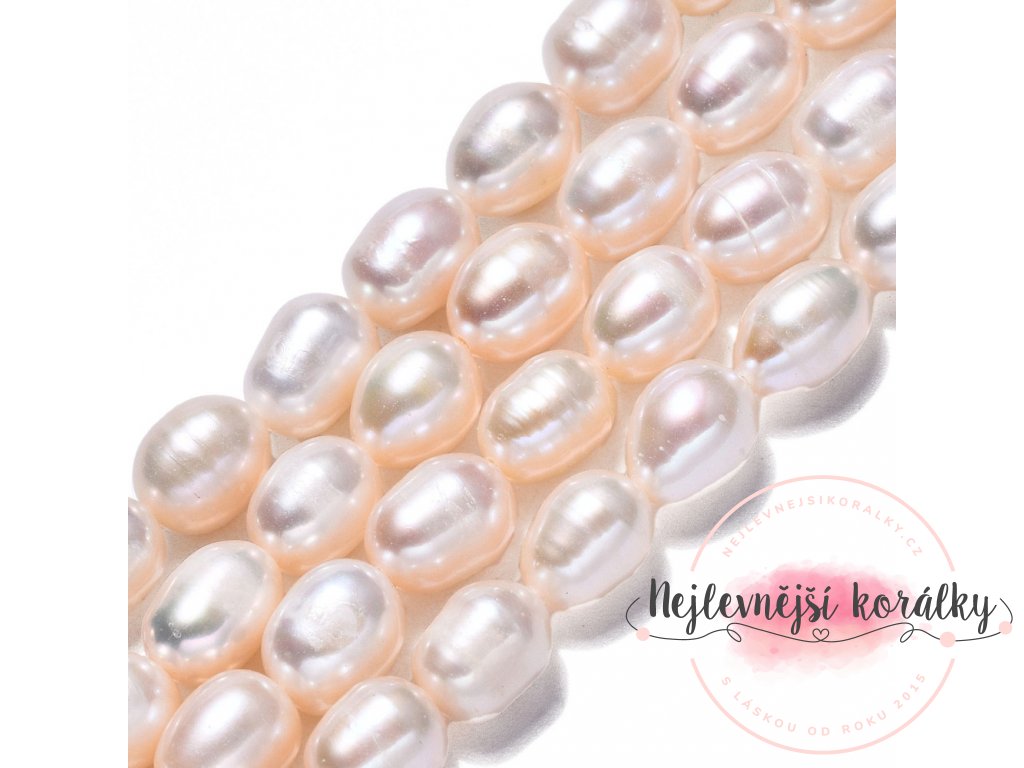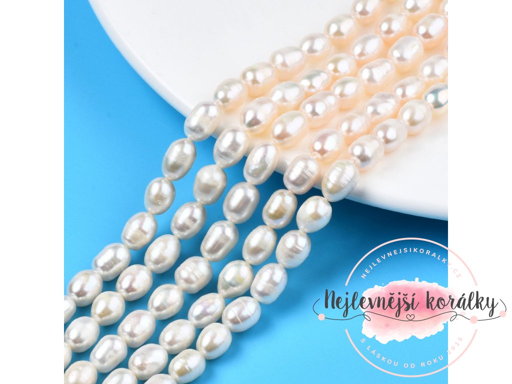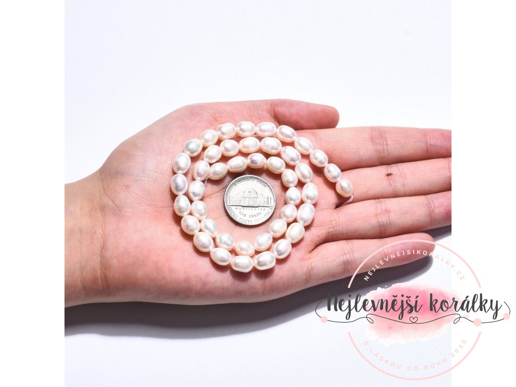 Exkluzivní přírodní sladkovodní perla třídy AA o velikosti cca 8 - 9 mm x 6 - 7 mm s velikostí průvleku 0,7 mm.