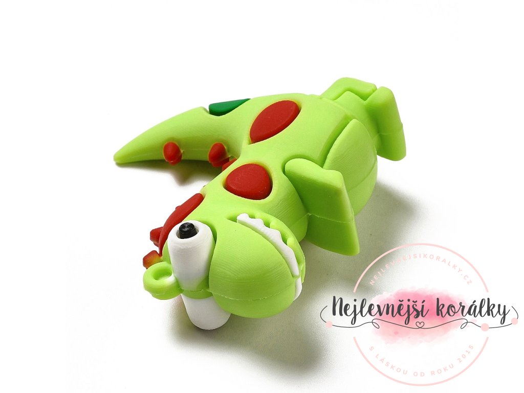Přívěsek je zhotoven v hravém zeleném provedení s detaily v bílé, červené a černé barvě, které přidávají na jeho jedinečnosti. Vyrobený je z barevného a ohebného plastu, je příjemný na dotek a odolný.