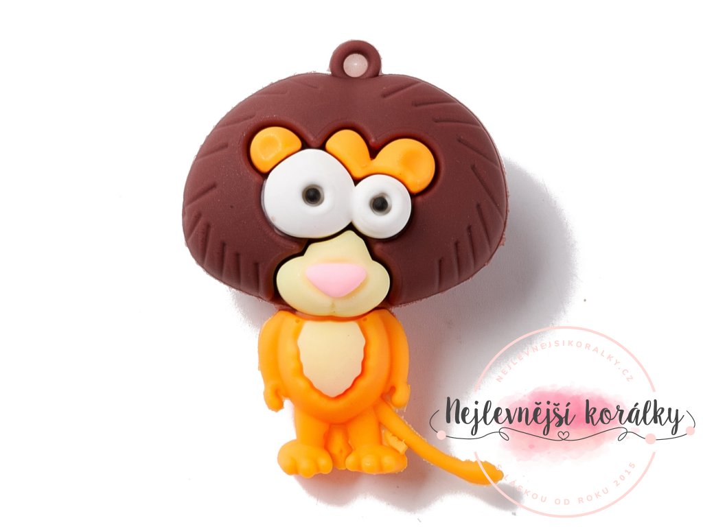 Přívěsek z měkkého plastu ve tvaru lva o výrazné velikosti 51 x 38 x 24 mm s velikostí průvleku 3 mm.