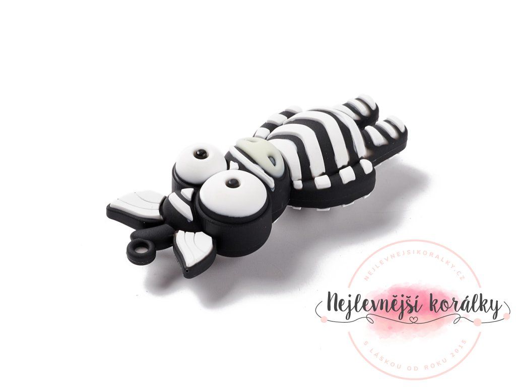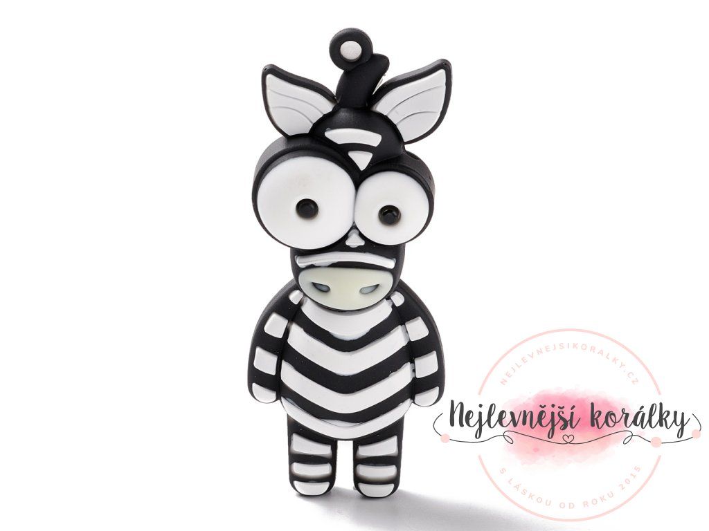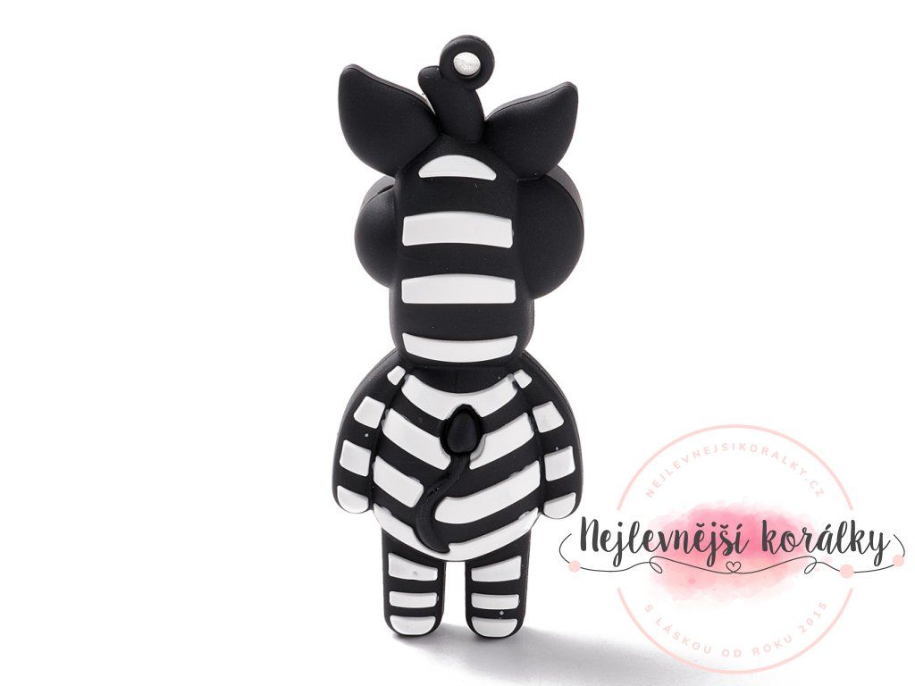 Přívěsek z měkkého plastu ve tvaru zebry o výrazné velikosti 69 x 28 x 20 mm s velikostí průvleku 3 mm.