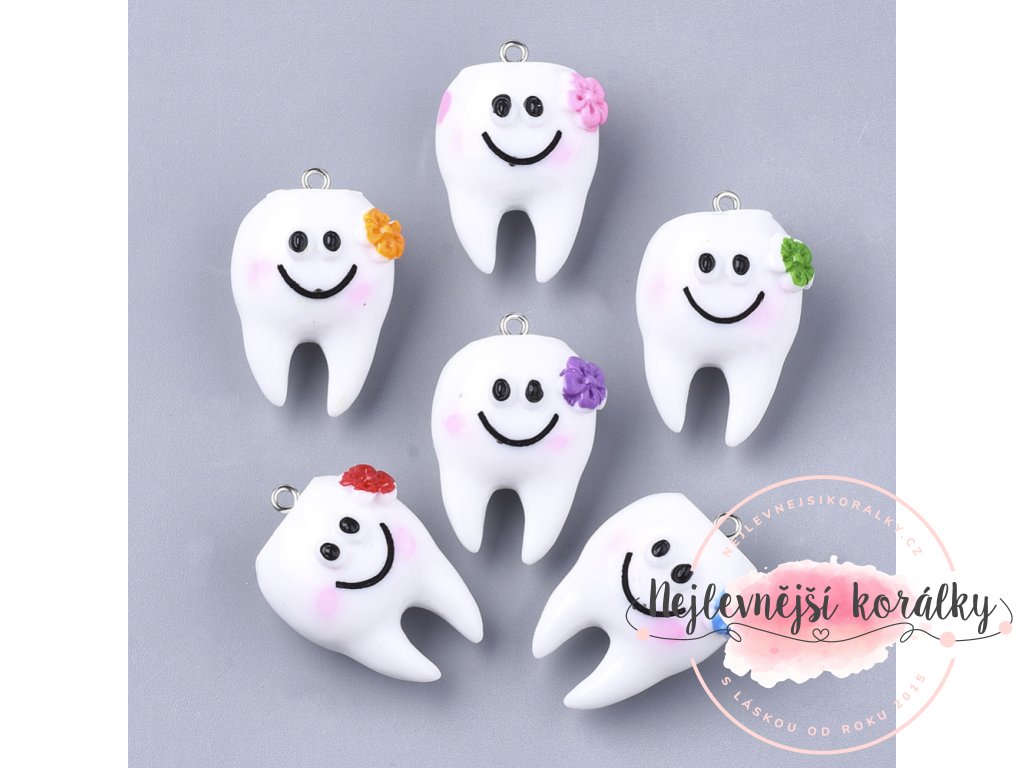 Přívěsek z tvrzené pryskyřice ve tvaru zubu s květem a úsměvem o velikosti 32 x 21 x 17 mm s velikostí průvleku 2 mm.