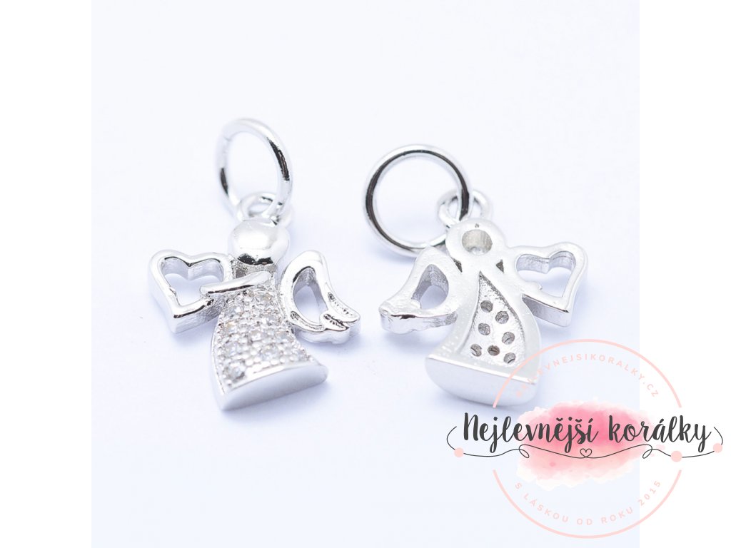 Mosazný přívěsek s kubickými zirkony - platinový - anděl - 12 x 9,5 x 2 mm - 1 ks