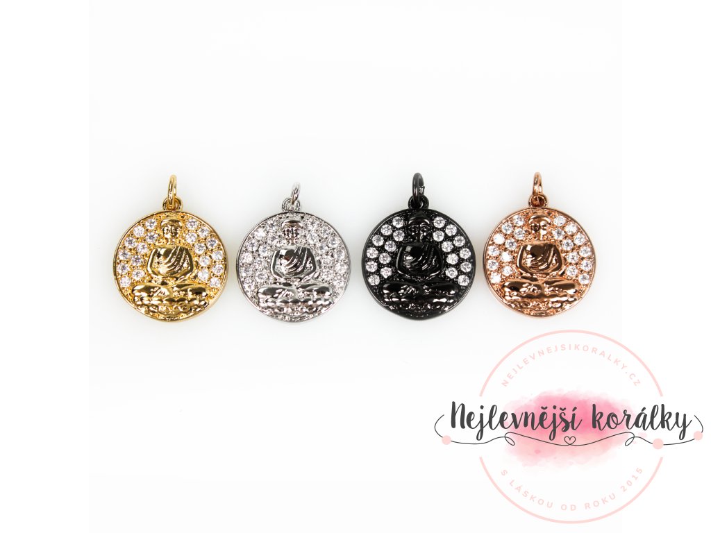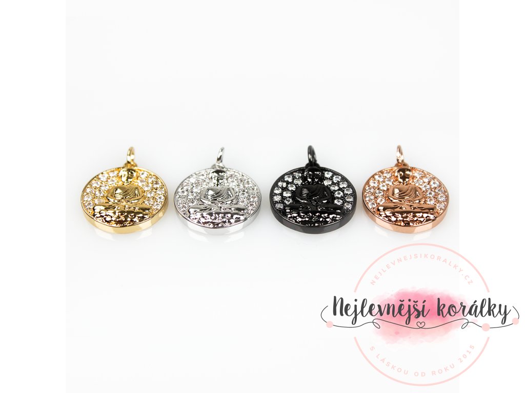 Mosazný přívěsek s kubickými zirkony - různá provedení - placička s Buddhou - 23 x 17 x 4 mm - 1 ks