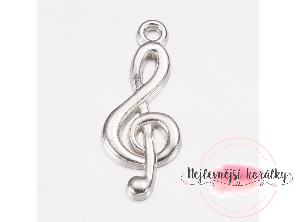 Kovový přívěsek ve tvaru houslového klíče o výšce 26 mm, šířce 10 mm, hloubce 2 mm s velikostí průvleku 2 mm.