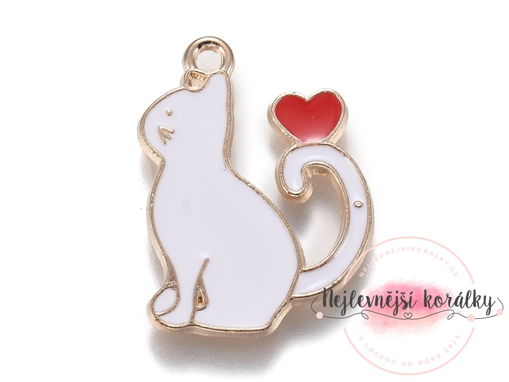 Kovový přívěsek ve tvaru koťátka se srdíčkem v bílém smaltovaném provedení.