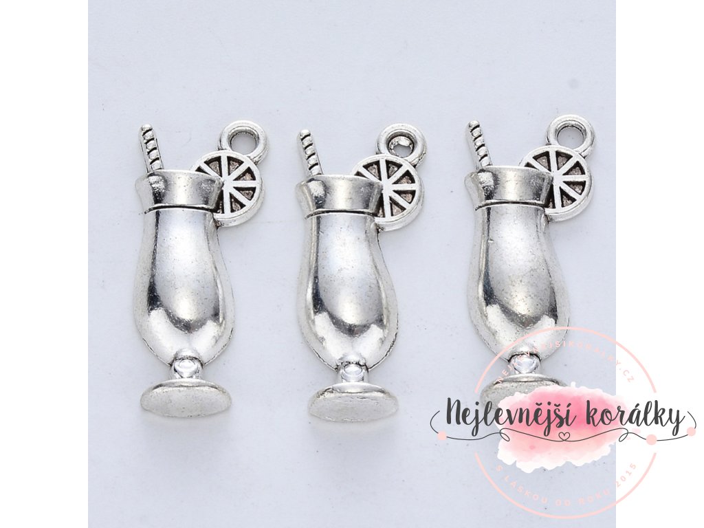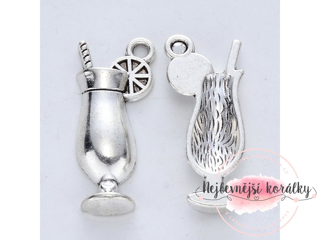 Kovový přívěsek ve tvaru koktejlové sklenice s citrusem a brčkem o výšce 27 mm a šířce 11 mm s velikostí průvleku cca 2 mm.