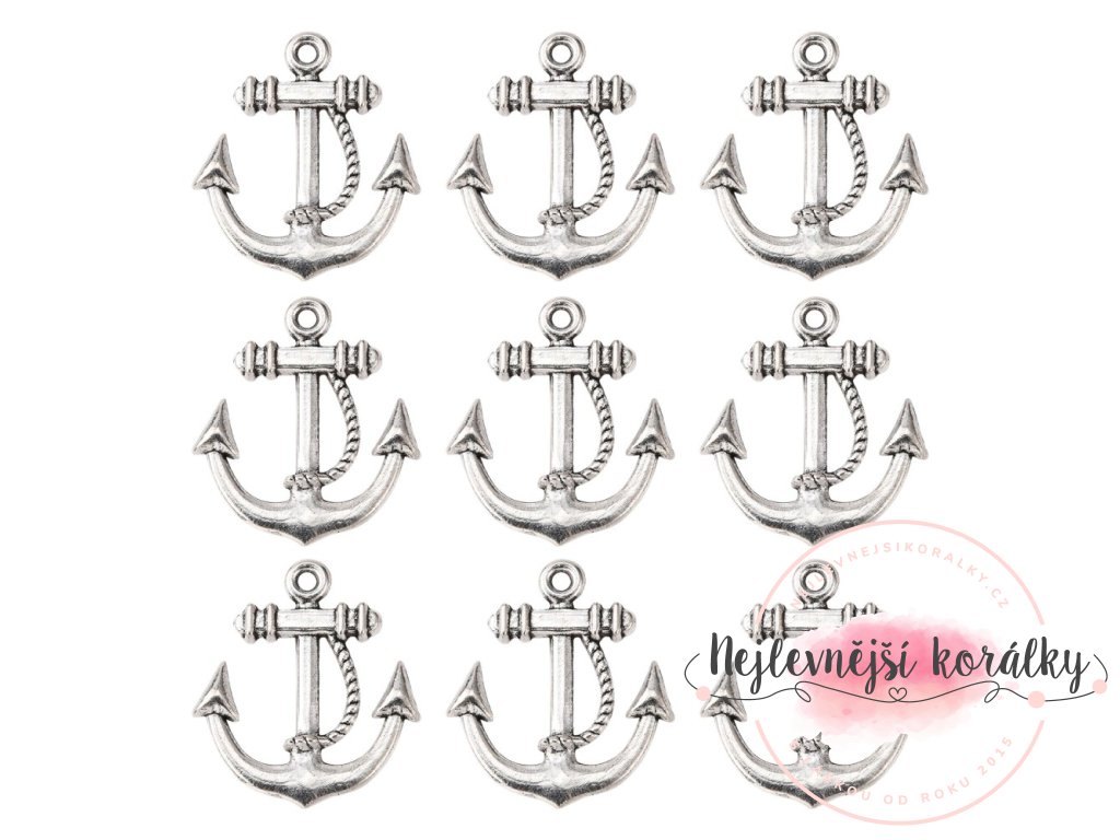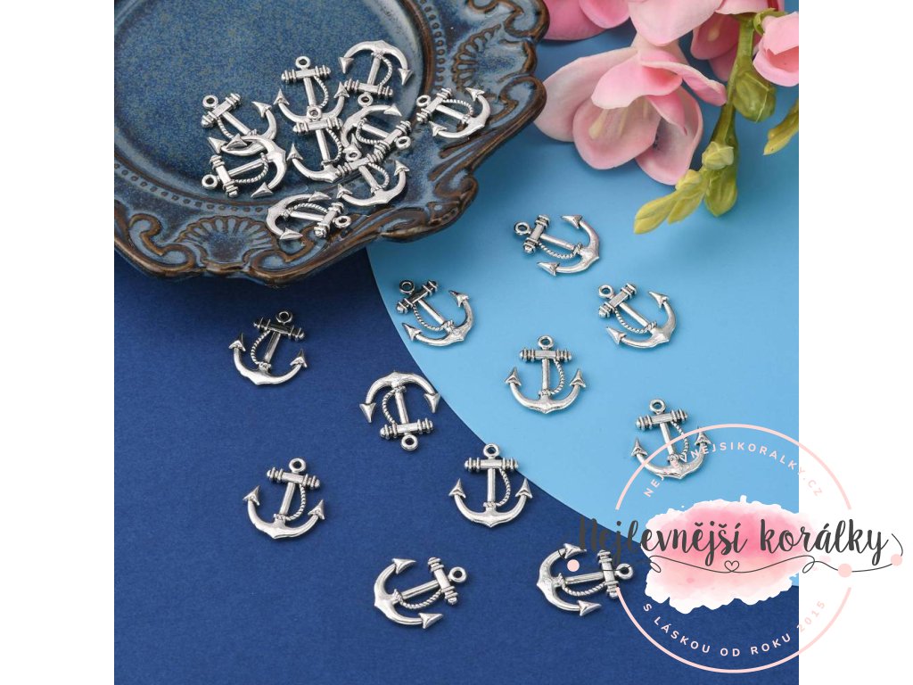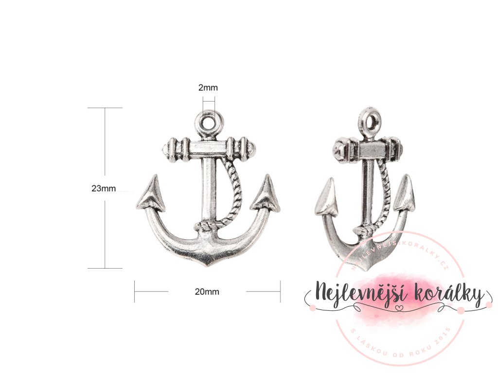 Kovový přívěsek ve tvaru kotvy o výšce 23 mm, šířce 20 mm, hloubce 2 mm s velikostí průvleku cca 2 mm.