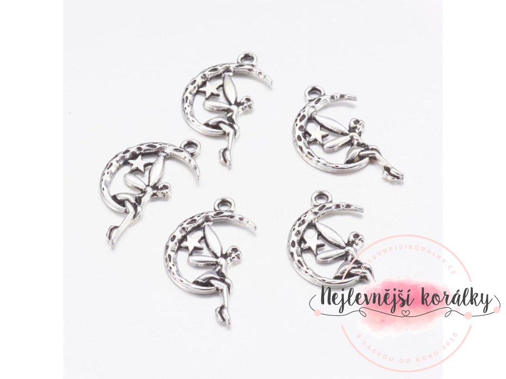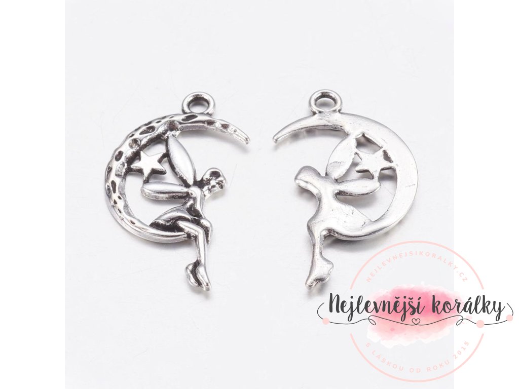 Kovový přívěsek ve tvaru pohádkové víly o výšce 25 mm, šířce 14 mm, hloubce 3 mm s velikostí průvleku 1,5 mm.