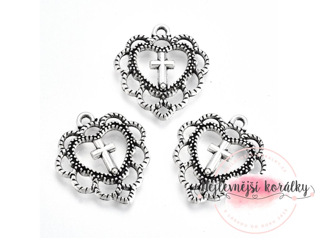 Kovový přívěsek - srdce s křížem - starostříbrný - 21 x 20 x 3 mm - 1 ks