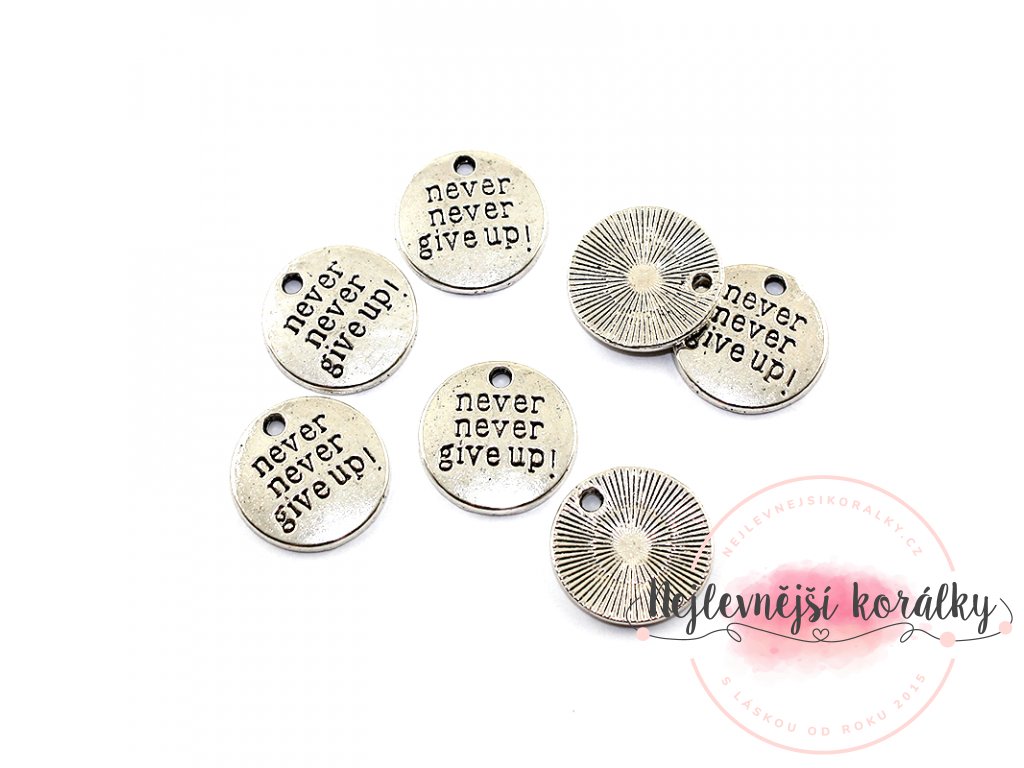 Přívěsek s nápisem "never never give up!" – "nikdy, nikdy to nevzdávej"!