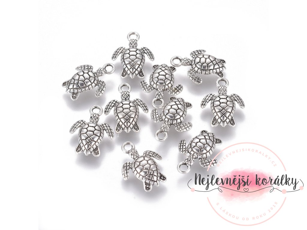 Kovový přívěsek ve tvaru želvičky o výšce 16 mm, šířce 12 mm, hloubce 3 mm s velikostí průvleku 1 mm.