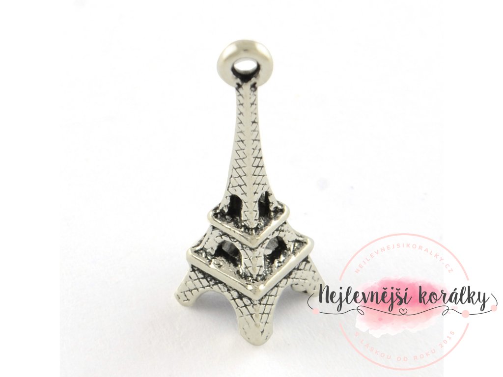 Kovový přívěsek ve tvaru Eiffelovy věže o výšce 23 mm, šířce 8 mm, hloubce 8 mm s velikostí průvleku 1,5 mm.