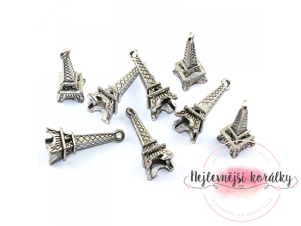 Kovový přívěsek ve tvaru Eiffelovy věže o výšce 24 mm, šířce 8 mm, hloubce 6 mm s velikostí průvleku 1,5 mm.