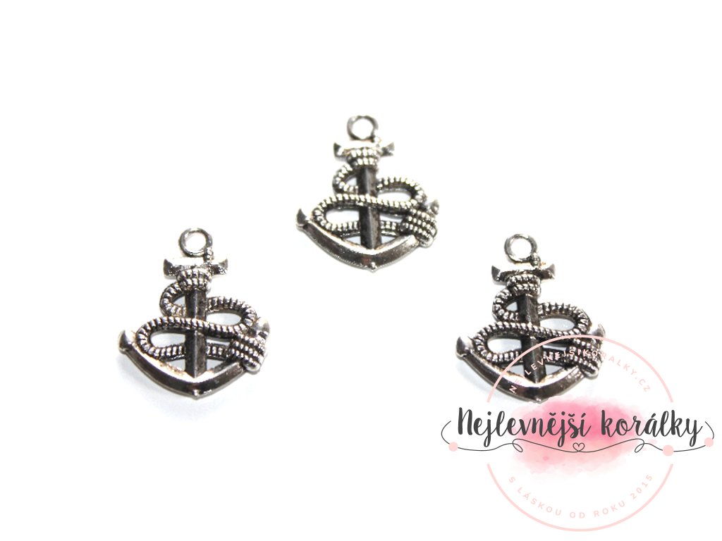 Kovový přívěsek ve tvaru kotvy o výšce 24 mm, šířce 19 mm, hloubce 3 mm s velikostí průvleku 3 mm.