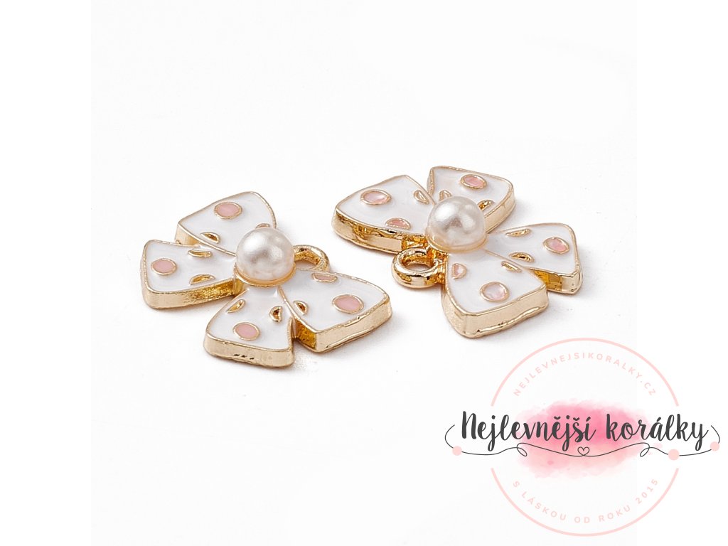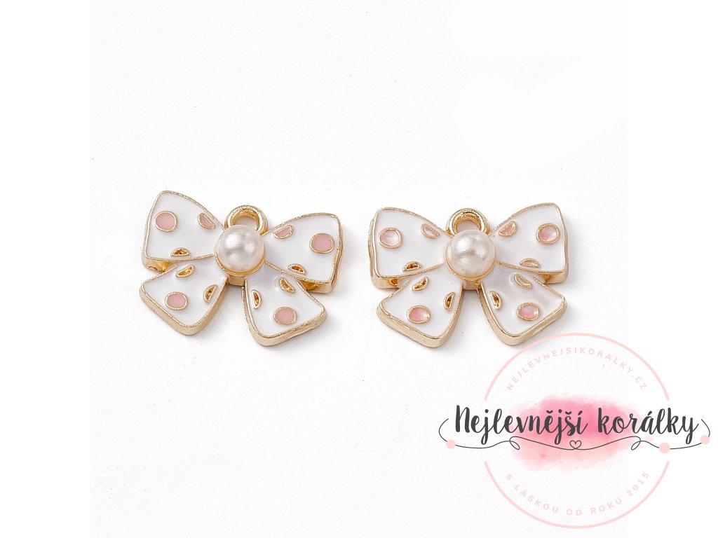 Kovový přívěsek - zlatý - bílá mašle s růžovými puntíky - 12 x 16 x 5 mm - 1 ks