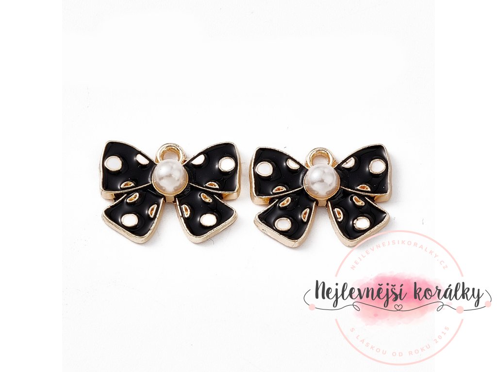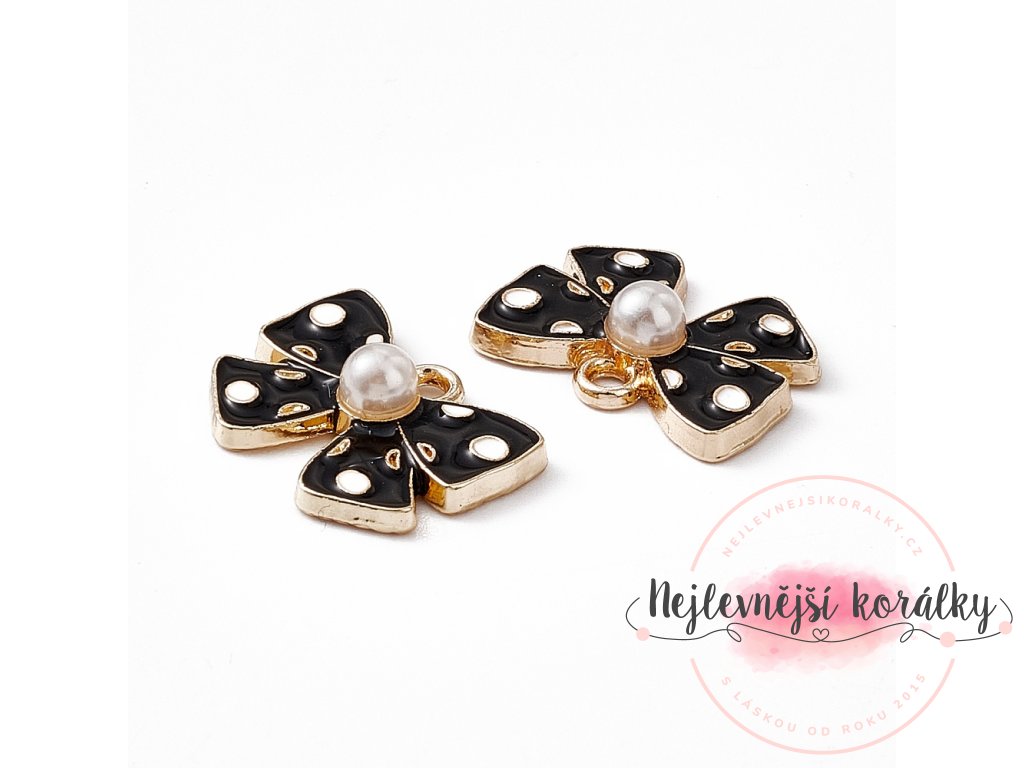 Kovový přívěsek - zlatý - černá mašle s bílými puntíky - 12 x 16 x 5 mm - 1 ks