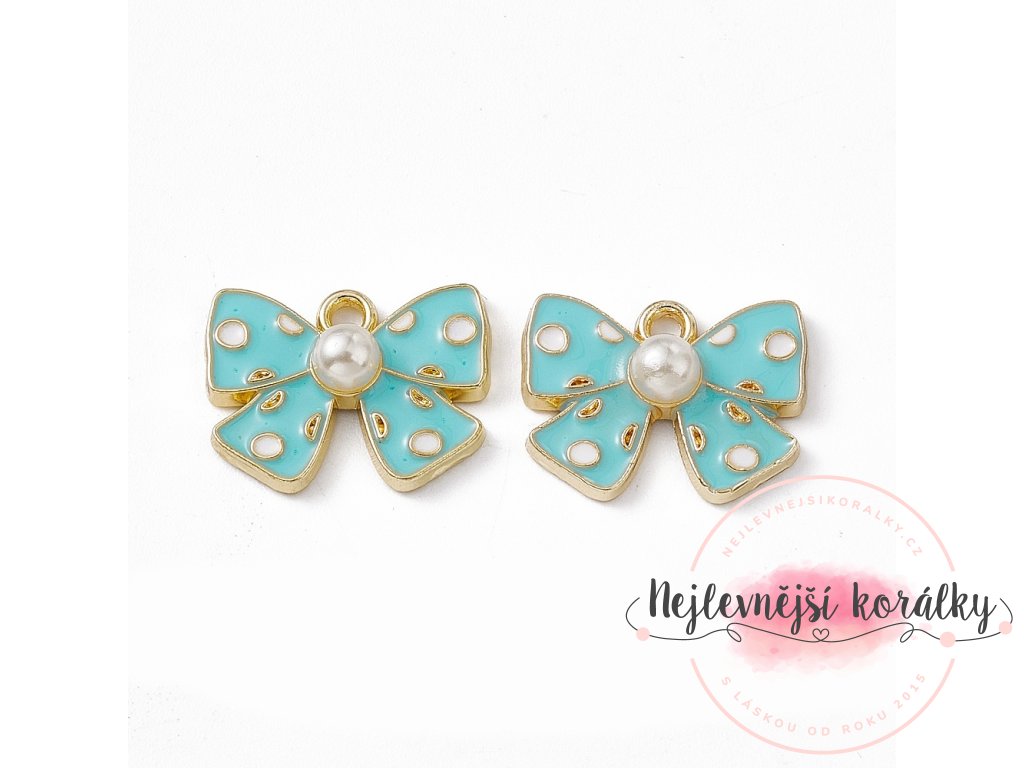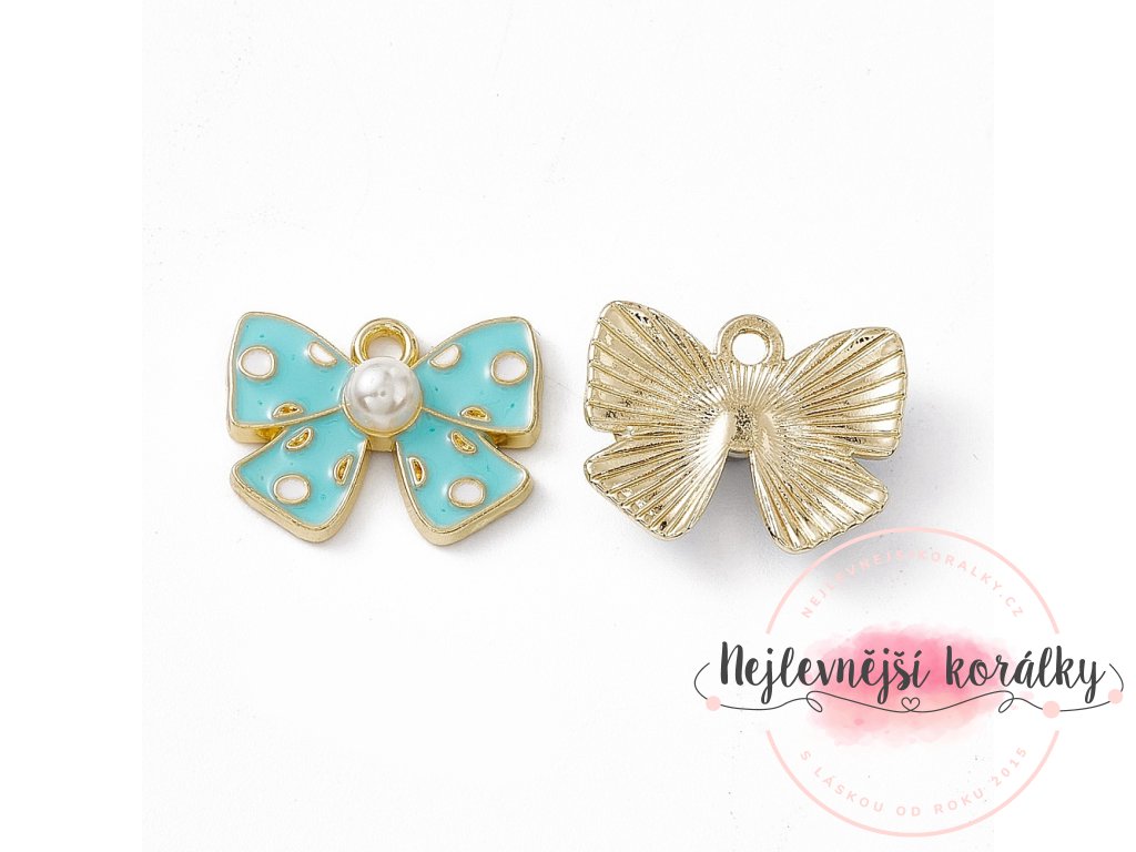 Kovový přívěsek - zlatý - tyrkysová mašle s bílými puntíky - 12 x 16 x 5 mm - 1 ks