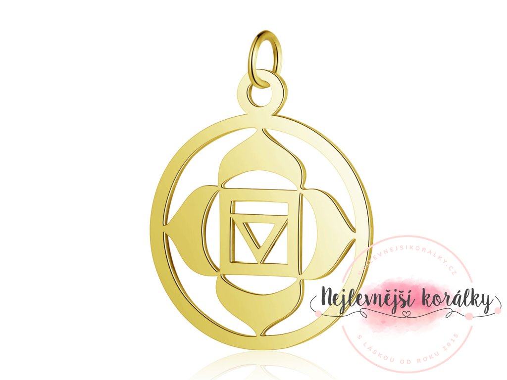 Přívěsek ve zlatém provedení je vyroben z nerezové oceli typu 304. Jedná se o první čakru, která nás spojuje s fyzickým světem. Převádí kosmické energie na tělesně-pozemskou rovinu, zároveň proudí touto čakrou energie Země do celého našeho systému energií.