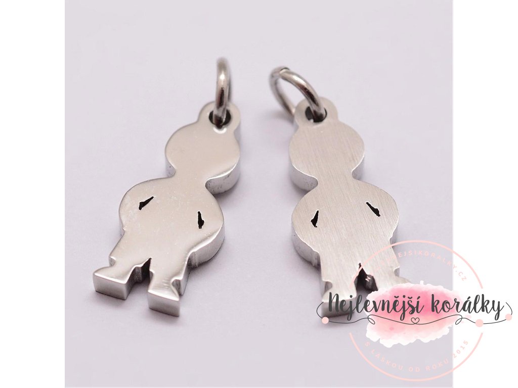 Kvalitní přívěsek ve tvaru chlapečka o výšce 16 mm, šířce 7 mm, hloubce 2 mm s velikostí průvleku 3 mm.