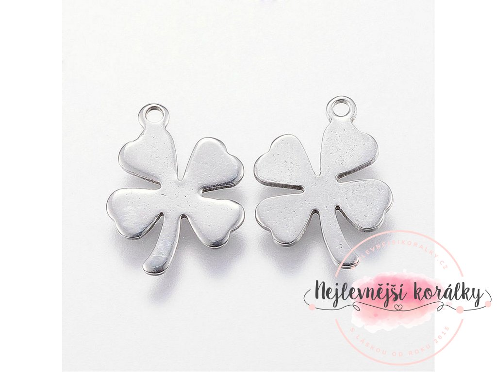 Kvalitní přívěsek ve tvaru čtyřlístku o výšce 13,5 mm, šířce 10 mm, hloubce 0,7 mm s velikostí průvleku 1 mm.