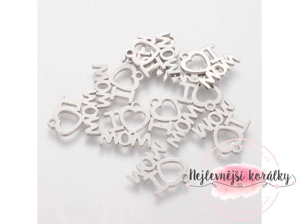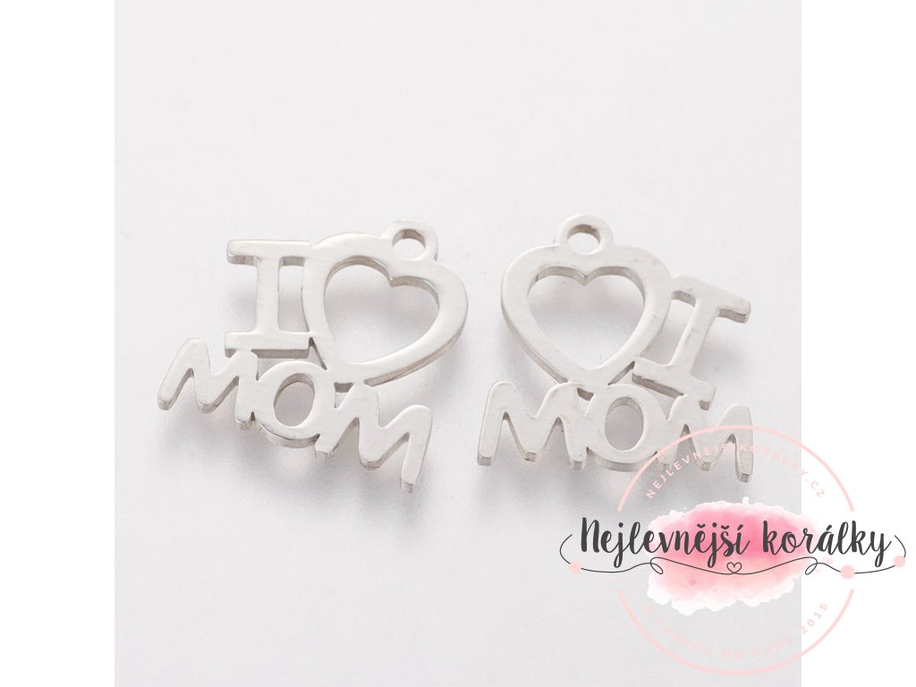 Kvalitní přívěsek ve tvaru nápisu I ♥ MOM o výšce 13 mm, šířce 13 mm, hloubce 1 mm s velikostí průvleku 1,5 mm.