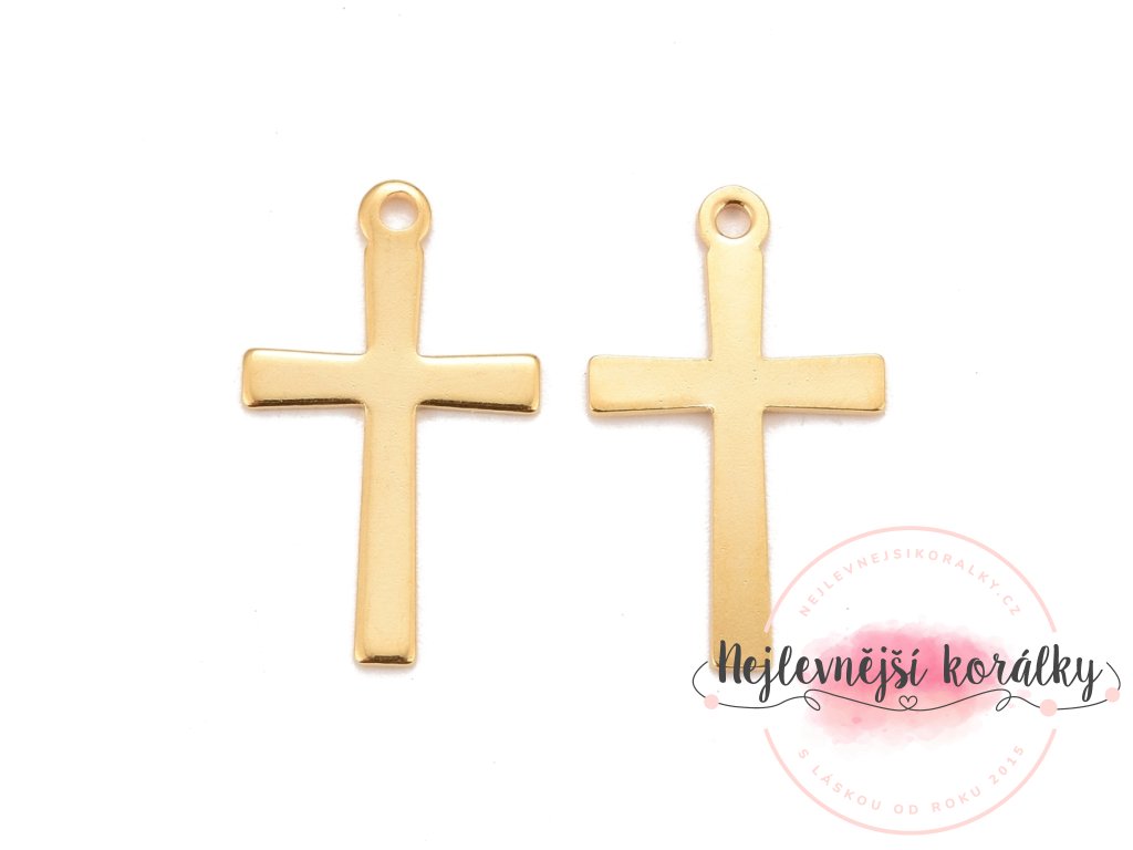 Kvalitní přívěsek ve tvaru kříže o výšce cca 20 mm, šířce 12 mm, hloubce 0,8 mm s velikostí průvleku 1,5 mm.
