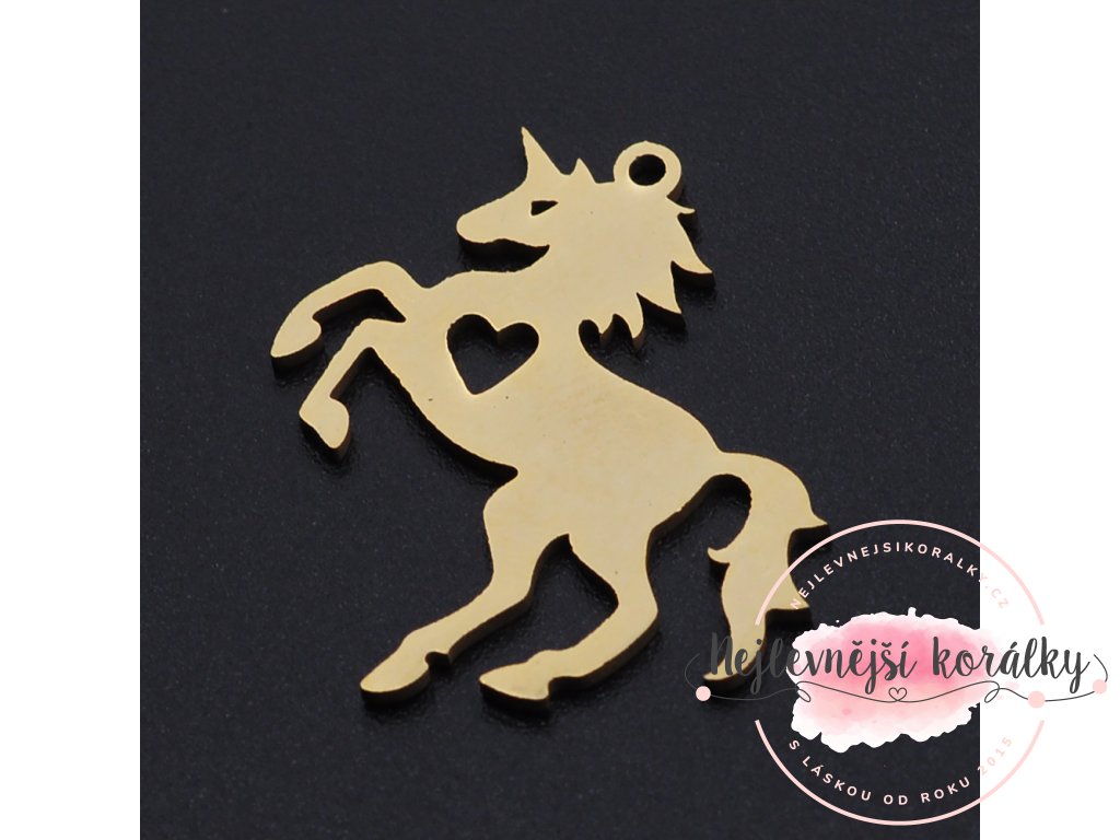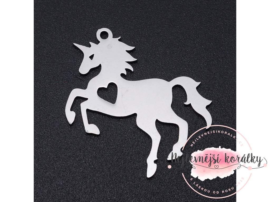 Kvalitní přívěsek ve tvaru koně se srdcem o výšce cca 25 mm, šířce cca 28 mm, hloubce cca 1 mm s velikostí průvleku cca 1 mm.
