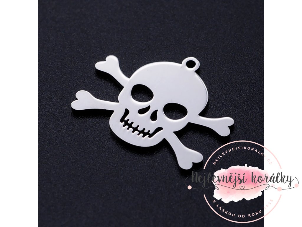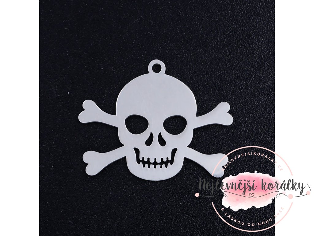Kvalitní přívěsek ve tvaru pirátského znaku - lebky se zkříženými hnáty o výšce 12 mm, šířce 15 mm, hloubce 1 mm a velikostí průvleku cca 1,5 mm.