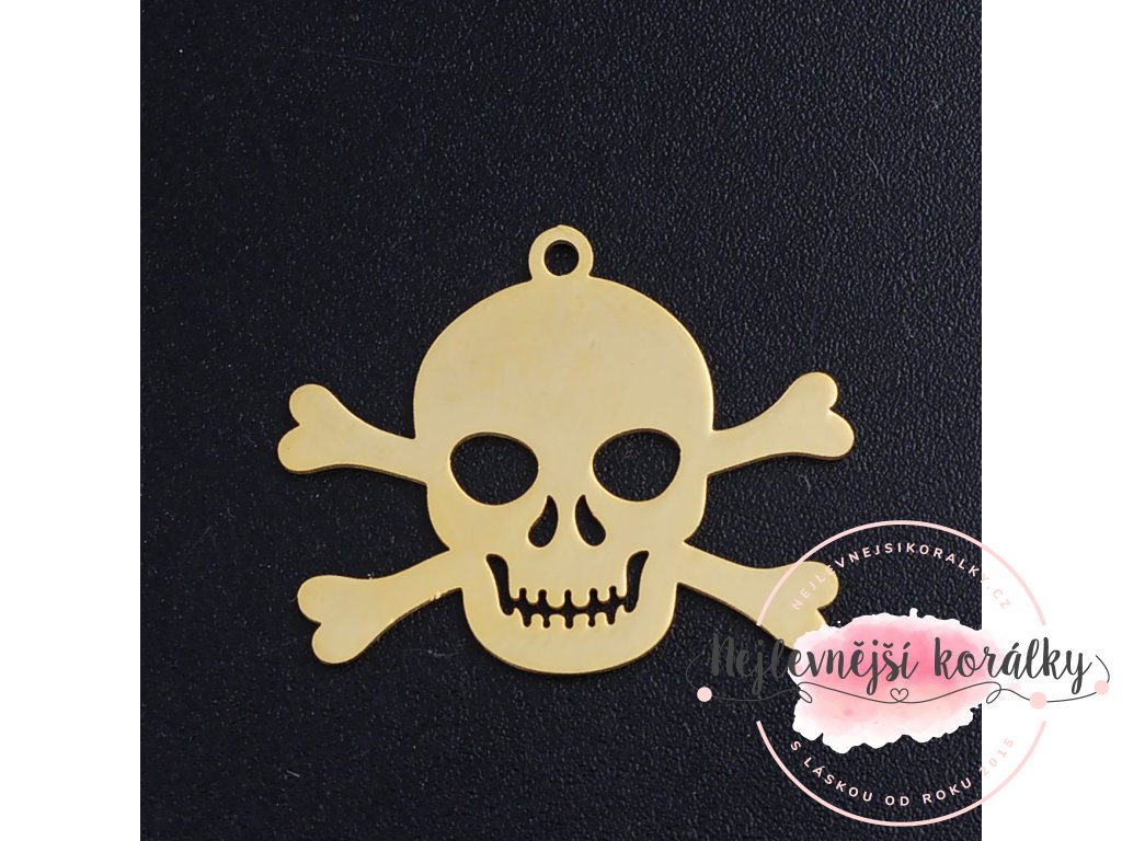 Přívěsek z nerezové oceli - lebka se zkříženými hnáty - zlatý - 12 x 15 x 1 mm - 1 ks