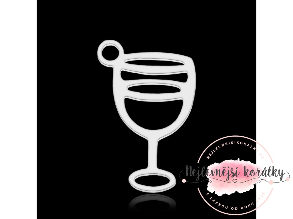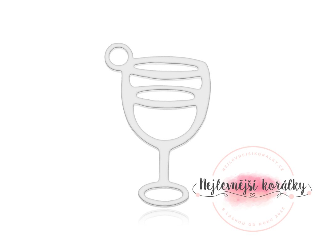 Kvalitní přívěsek ve tvaru skleničky vína o výšce 16 mm, šířce 10 mm, hloubce 1 mm a velikostí průvleku cca 1,6 mm.