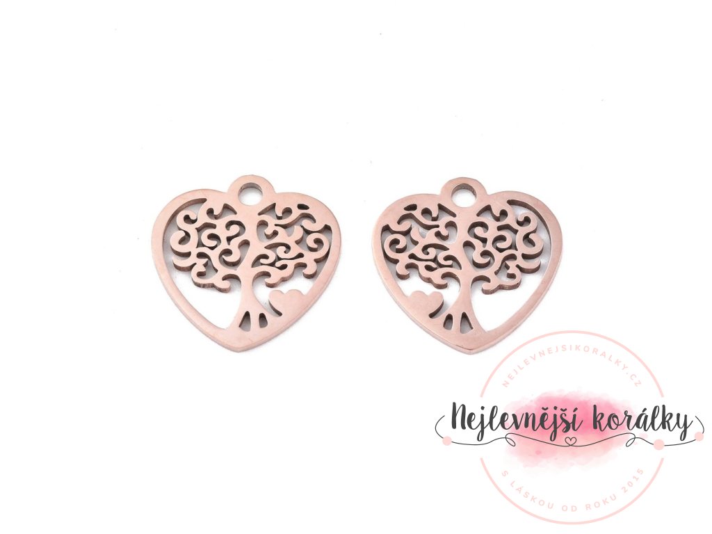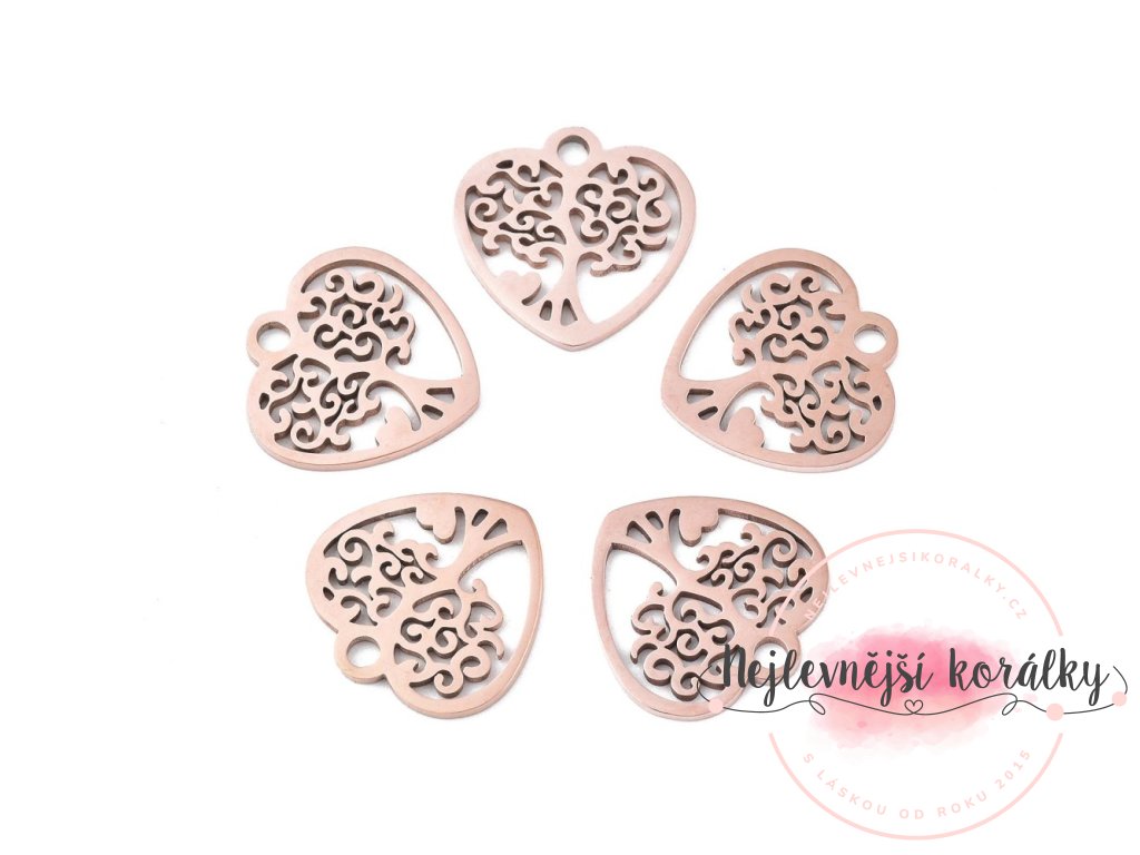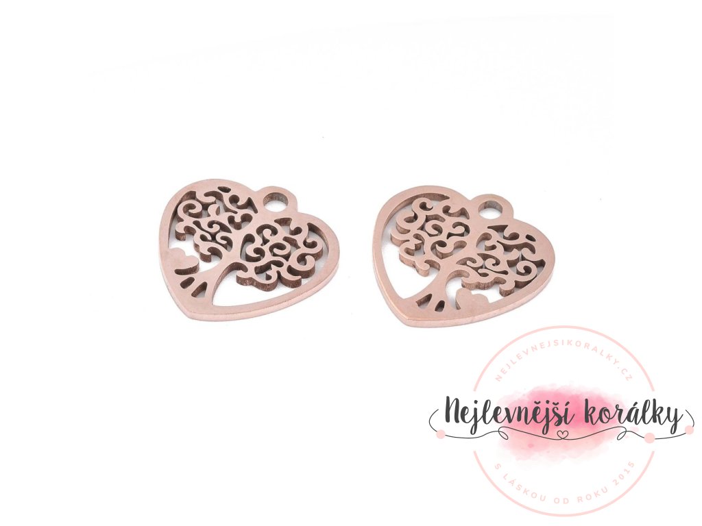 Přívěsek z nerezové oceli - srdce se stromem - růžově zlaté - 15,5 x 15,5 x 1 mm - 1 ks