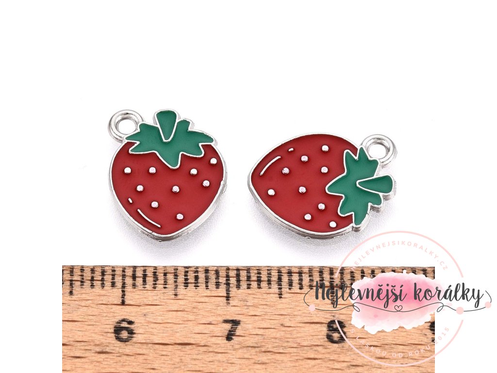 Kovový přívěsek ve tvaru jahody vnese do vašich šperků šťavnatou svěžest a hravý letní nádech. Červený smalt se zelenými detaily působí veselým a živým dojmem, takže přívěsek krásně vynikne na náramcích, náhrdelnících i drobných dárkových doplňcích.