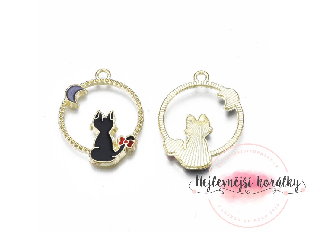 Kovový přívěsek - kočka - černá ve zlatém kruhu - 28 x 22 x 2 mm - 1 ks