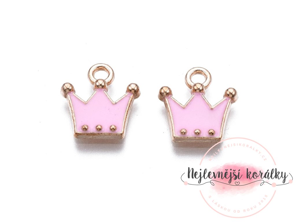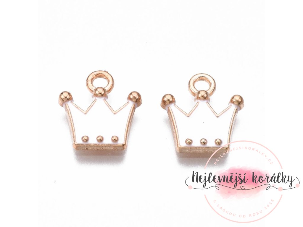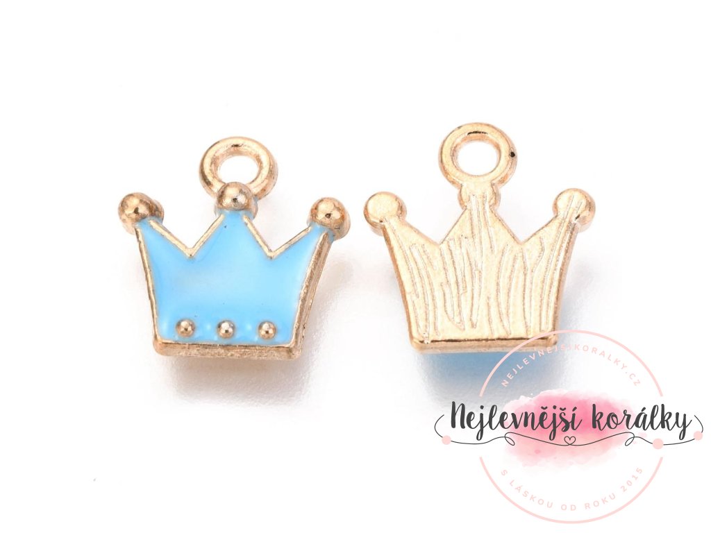 Kovový přívěsek ve tvaru korunky o velikosti cca 11,5 × 10,5 mm, tloušťce 2 mm a průvleku 1,5 mm.