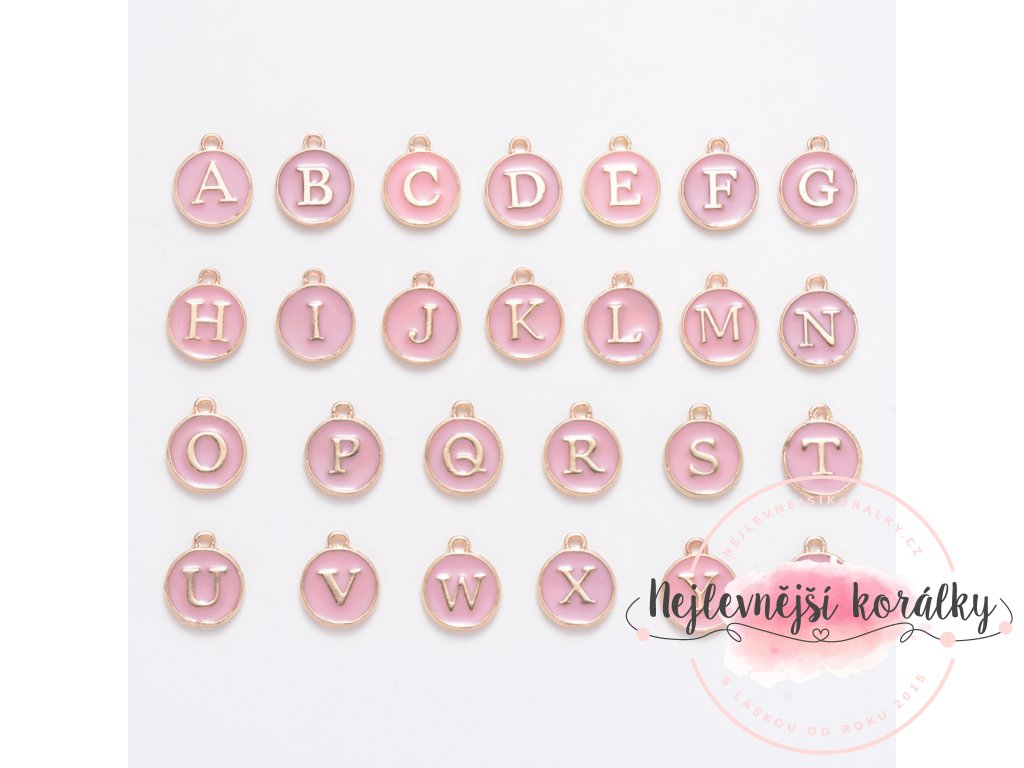 Kovový přívěsek - růžový - placička s písmenem - "A - Z" - 14 x 12 x 2 mm - sada