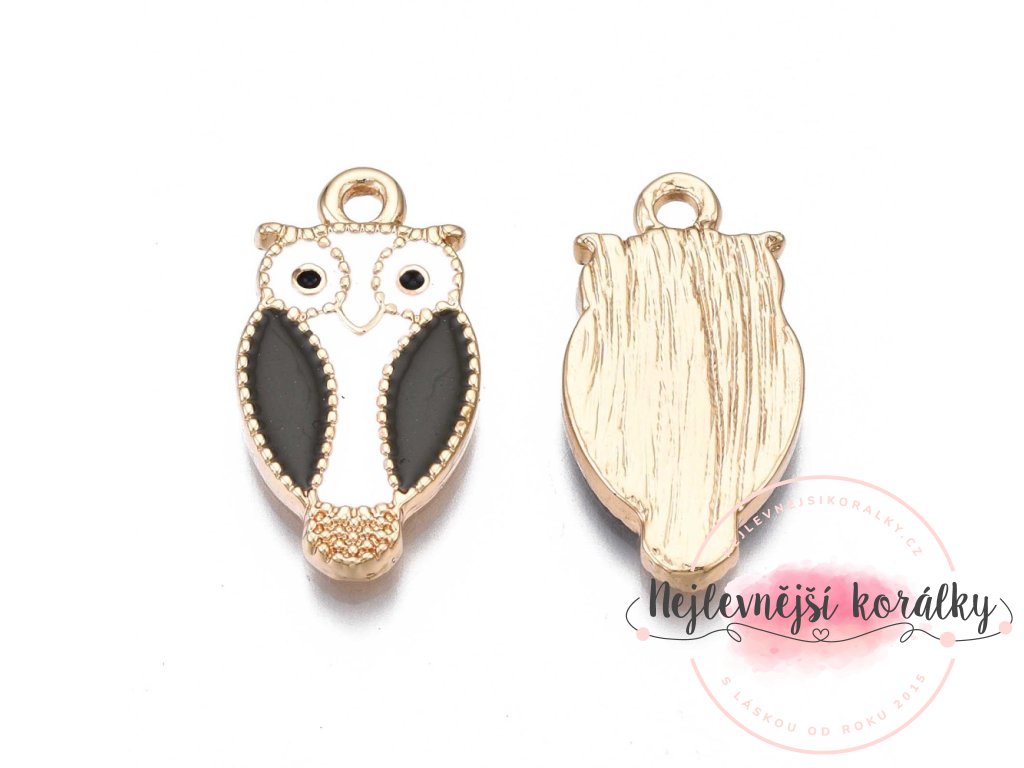 Kovový přívěsek - sova - černo bílá - 22 x 11 x 2 mm - 1 ks