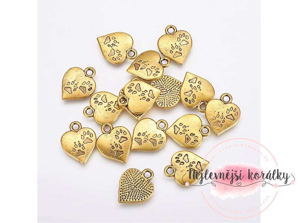 Kovový přívěsek - srdce s tlapkami - zlatý - 17 x 13 x 2 mm - 1 ks