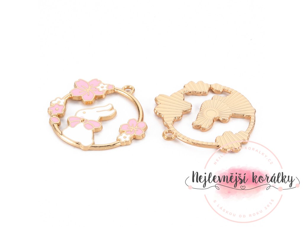 Kvalitní přívěsek ve tvaru zajíčka s růžovou mašličkou v kruhu s růžovými kvítky o rozměrech 30 x 31 mm a hloubce 2 mm s velikostí průvleku 1,8 mm.