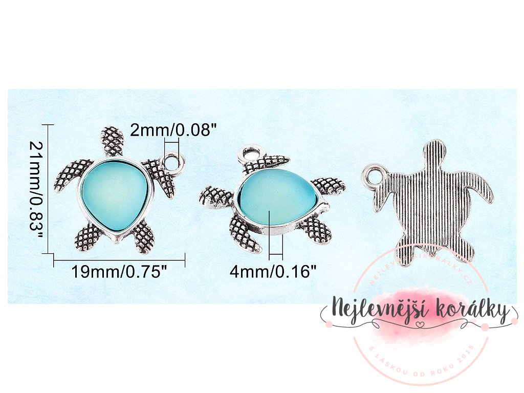 Kvalitní přívěsek ve tvaru želvy o rozměrech 21 x 19 mm a hloubce cca 3 mm s velikostí průvleku cca 2 mm.