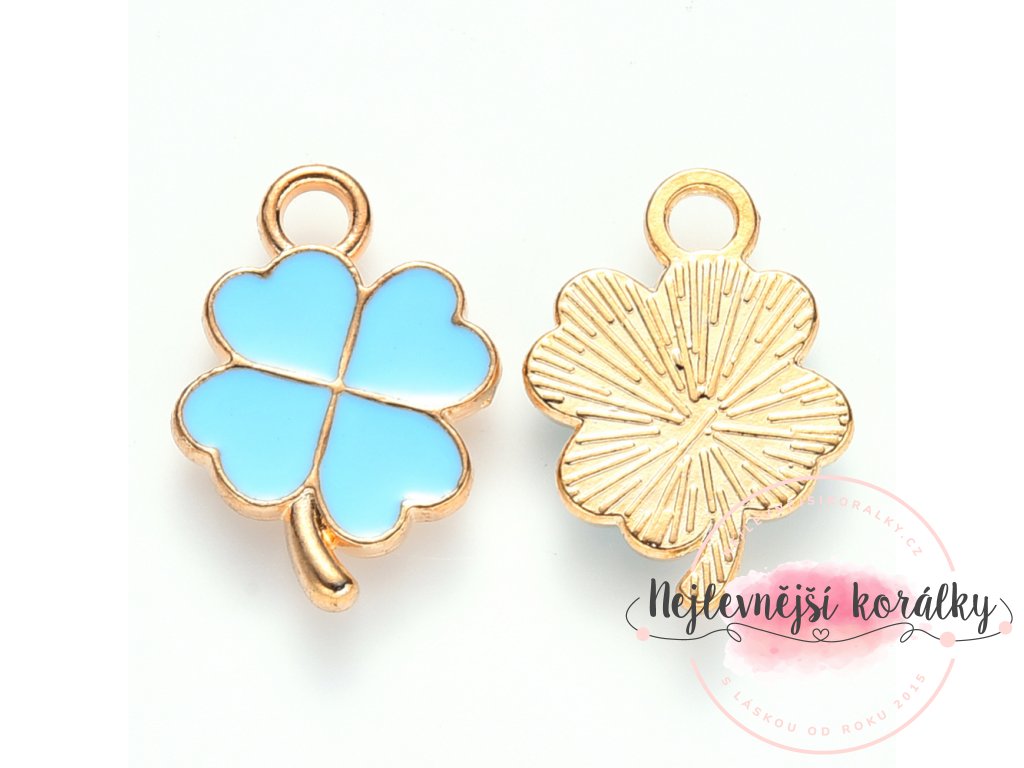 Kovový přívěsek - zlatý čtyřlístek - světle modrý - 18 x 12 x 1,5 mm - 1 ks