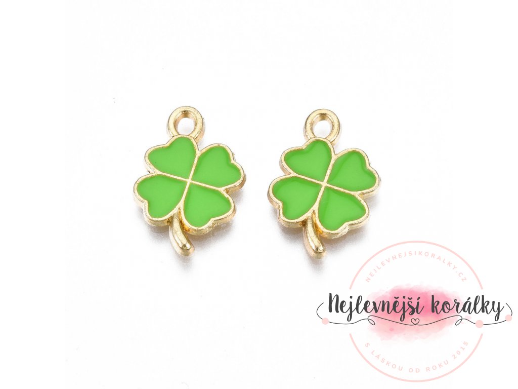 Kovový přívěsek - zlatý čtyřlístek - světle zelený - 19 x 13 x 1,5 mm - 1 ks