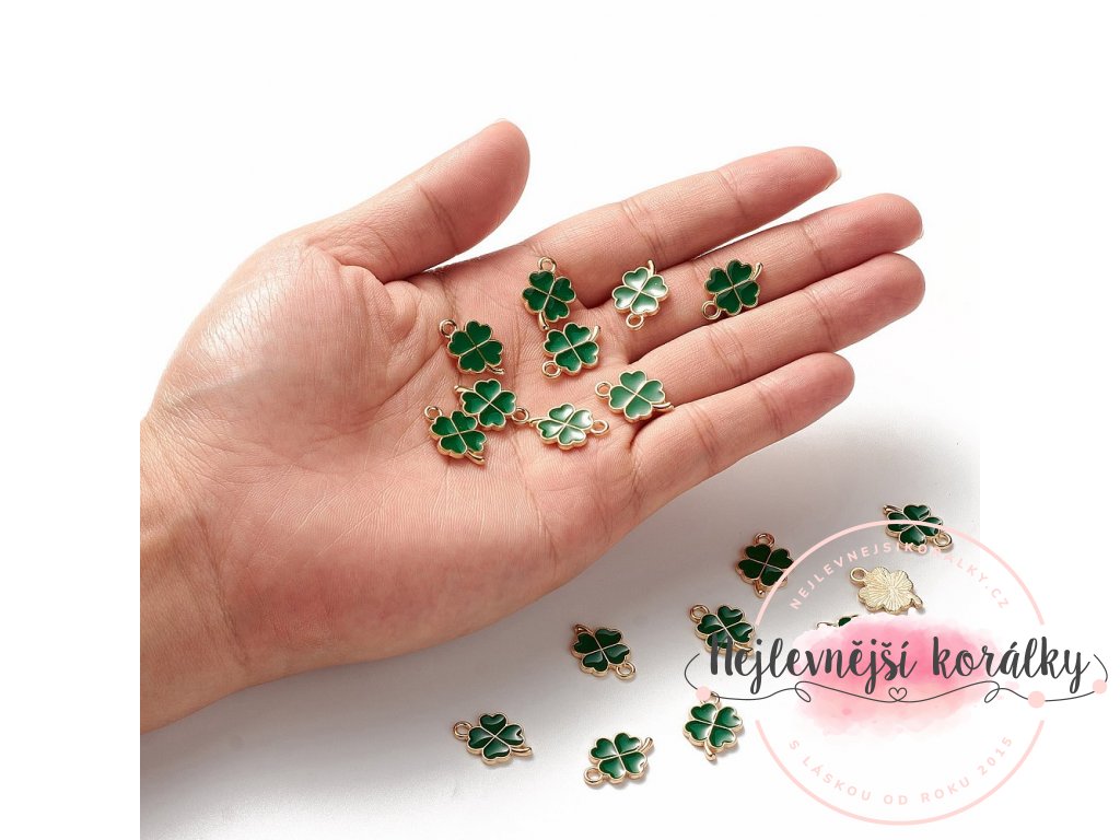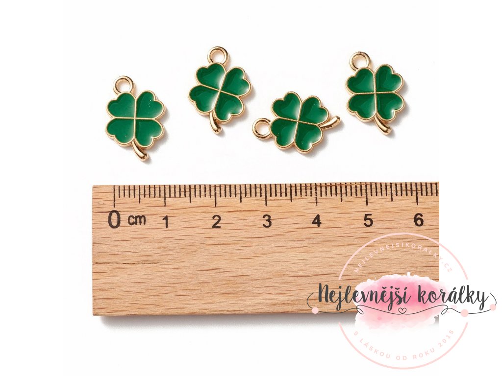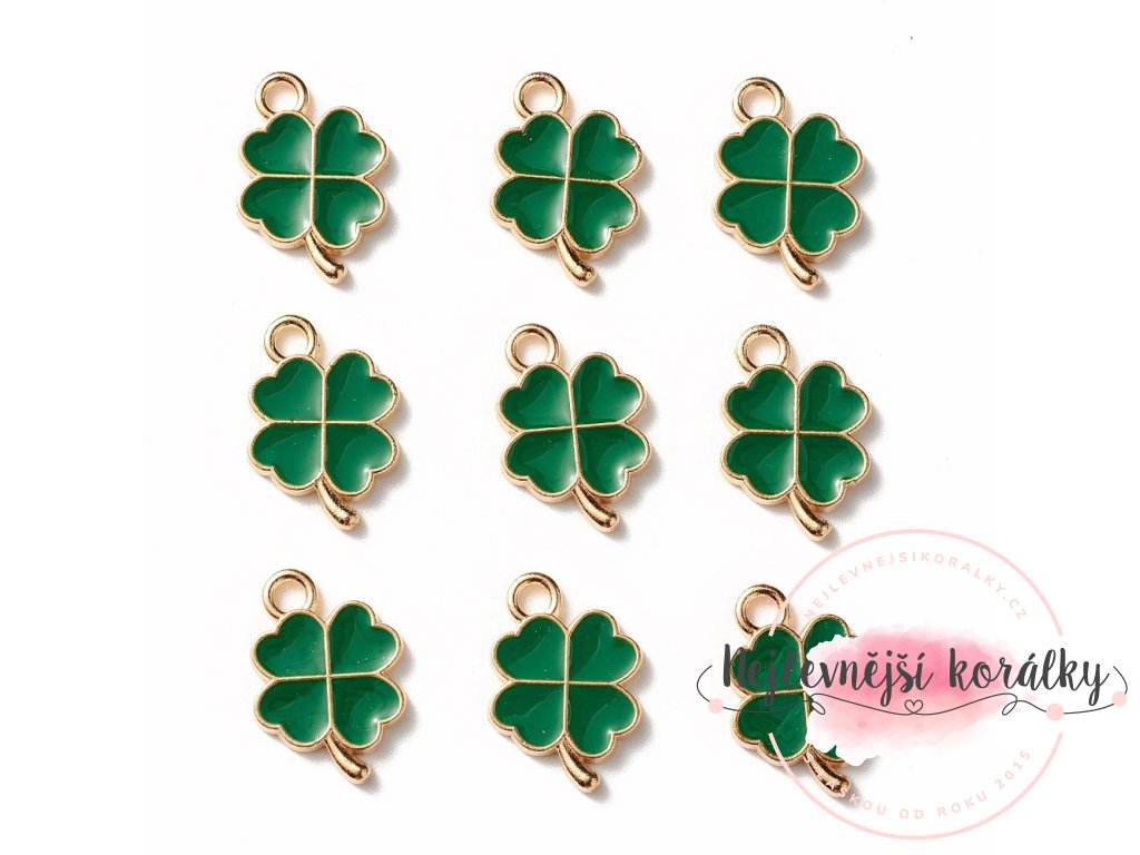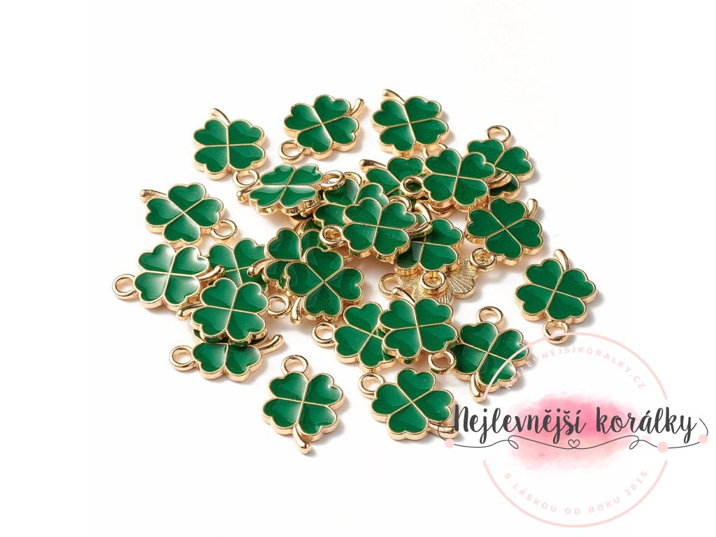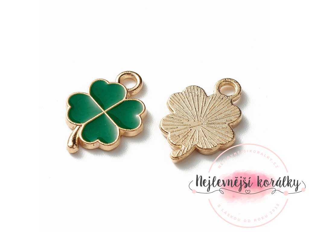 Kovový přívěsek - zlatý čtyřlístek - tmavě zelený - 19 x 13 x 1,5 mm - 1 ks