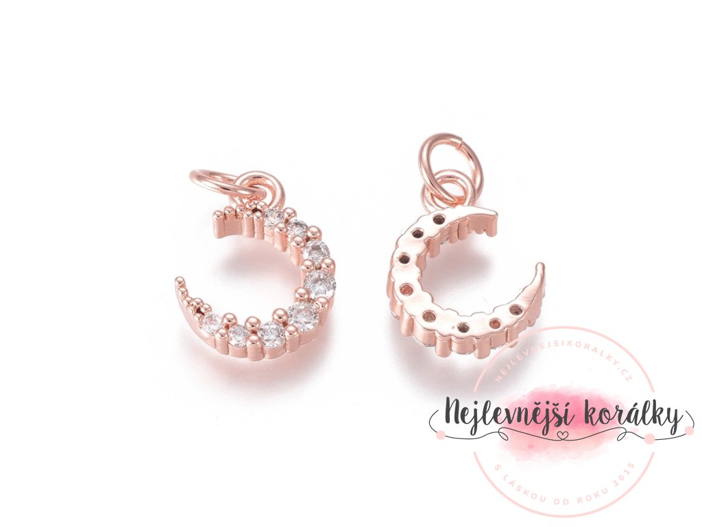 Kvalitní mosazný přívěsek ve tvaru měsíce o výšce 12,5 mm, šířce 9 mm, hloubce 3 mm s kroužkem o velikostí průvleku 3,6 mm.