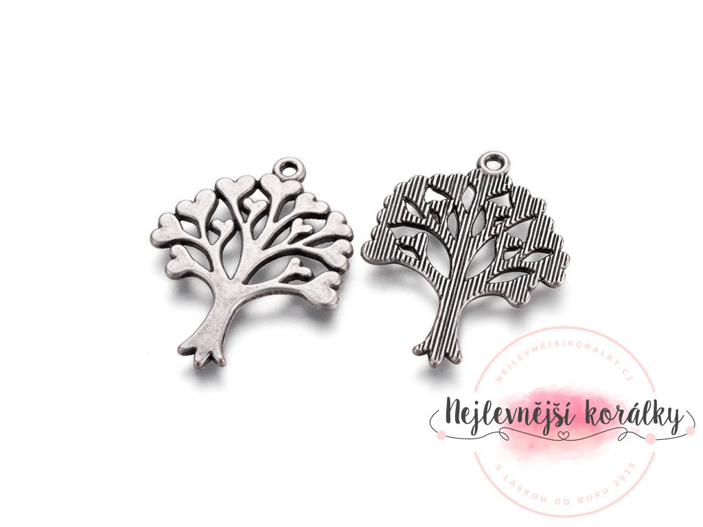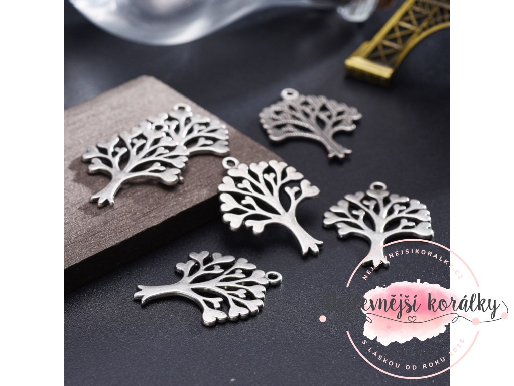 Kvalitní větší mosazný přívěsek ve tvaru stromu života se srdíčky o výšce 33 mm, šířce 25 mm, hloubce 2 mm s velikostí průvleku 2 mm.